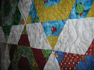 I have another UFO finish. Woohoo!!!!!! The Hexagon stars baby quilt is done. I'm doing a happy, happy dance. I didn't have anything in my quilting designs library that I thought would suit this quilt, so I took a chance and for the first time, designed a pantograph. What a challenge that was. It gave me a whole new respect for the people who do all those wonderful designs we use so frequently. Coming up with the basic design was easy. I knew I wanted fish. But, getting it to all fit together, and nest properly from one row to the next was where the challenge came in. The close up shows a really good shot of one of the fish. I'm really quite pleased with the way it turned out. Then, while going through the design wall posts last Monday, I found a link to a wonderful tutorial on how to do a Faux piped binding that could be completely sewn on by machine. I tried it, and it was wonderful. To make it even easier, I used the same fabric as the piping as was in the backing, so that there were no thread matching issues. This is definitely a keeper technique, for me at least. And, I really like the little bit of extra colour and detail that the piping gives it. To see more design walls, go on over to Patchwork Times Who knows, someone might have another great idea or technique that could add to, or change the way to do something to make it faster, prettier, and easier.