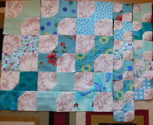 here. I only have the middle block to finish, and then this one can go together and get quilted. The pink and the dark grey batiks are the borders for it.